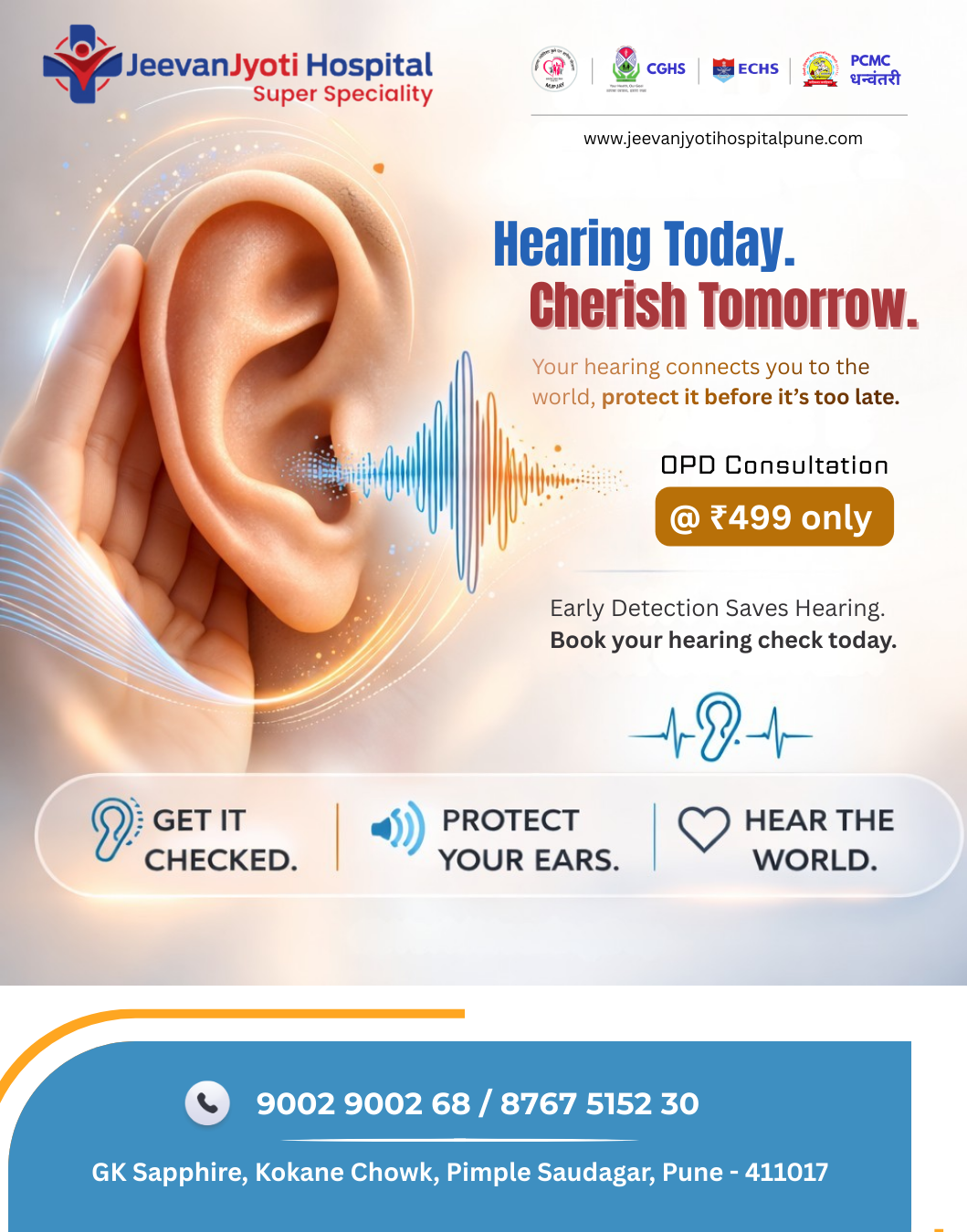 πŸ‘‚βœ¨ Hearing Today. Cherish Tomorrow. Don’t let hearing loss disconnect you from the world. Early detection saves hearing, protect your ears before it’s too late! βœ… OPD Consultation @ just β‚Ή499 πŸ₯ 110+ Beds Super-speciality πŸ“ Pimple Saudagar, Pune πŸ“ž 9002 9002 68 | 8767 5152 30 Visit us at: jeevanjyotihospitallune.com #ent #entsurgery #pcmc #throatdoctor #entdoctor