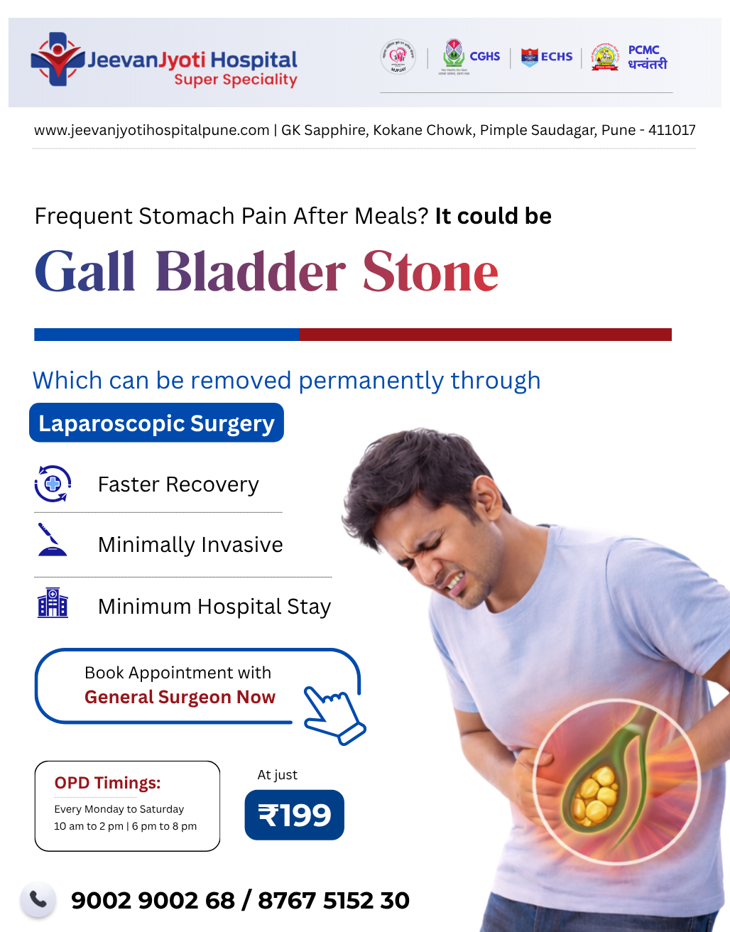 πŸ”₯ Frequent stomach pain after meals? It could be Gall Bladder Stones, a common yet often overlooked cause of abdominal discomfort. At JeevanJyoti Super-speciality Hospital, we offer advanced laparoscopic surgery to remove gall bladder stones permanently with: βœ… Faster Recovery βœ… Minimally Invasive Procedure βœ… Short Hospital Stay πŸ‘¨β€βš•οΈ Consult our experienced General Surgeons at just β‚Ή199 πŸ•™ OPD Timings: Monday to Saturday | 10 am – 2 pm & 6 pm – 8 pm πŸ“ Kokane Chowk, Pimple Saudagar, Pune πŸ“ž 9002 9002 68 | 8767 5152 30 🌐 www.jeevanjyotihospitalpune.com ✨ Don’t ignore the pain β€” book your appointment today and take the first step towards a healthier tomorrow.