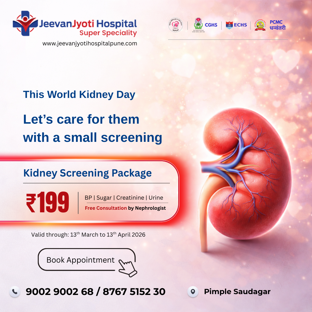 ๐Ÿ’™ This World Kidney Day, letโ€™s care for our kidneys with a simple step that makes a big difference! At Jeevan Jyoti Hospital Super Speciality, weโ€™re offering a Kidney Screening Package at just โ‚น199, designed to give you peace of mind and proactive care. ๐Ÿงช Package Includes: โœ”๏ธ Blood Pressure (BP) โœ”๏ธ Blood Sugar โœ”๏ธ Creatinine โœ”๏ธ Urine Analysis โœจ Plus: FREE Consultation with our expert Nephrologist ๐Ÿ“… Valid from 13th March to 13th April 2026 ๐Ÿ“ Pimple Saudagar | 9002 9002 68 Book your appointment today and take charge of your kidney health! #worldkidneyday #kidneyhealth #cghs #echs